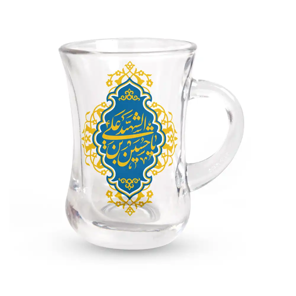 - استکان کمر باریک دسته دار یا حسین ابن علی الشهیدة شش عددی زمینه آبی