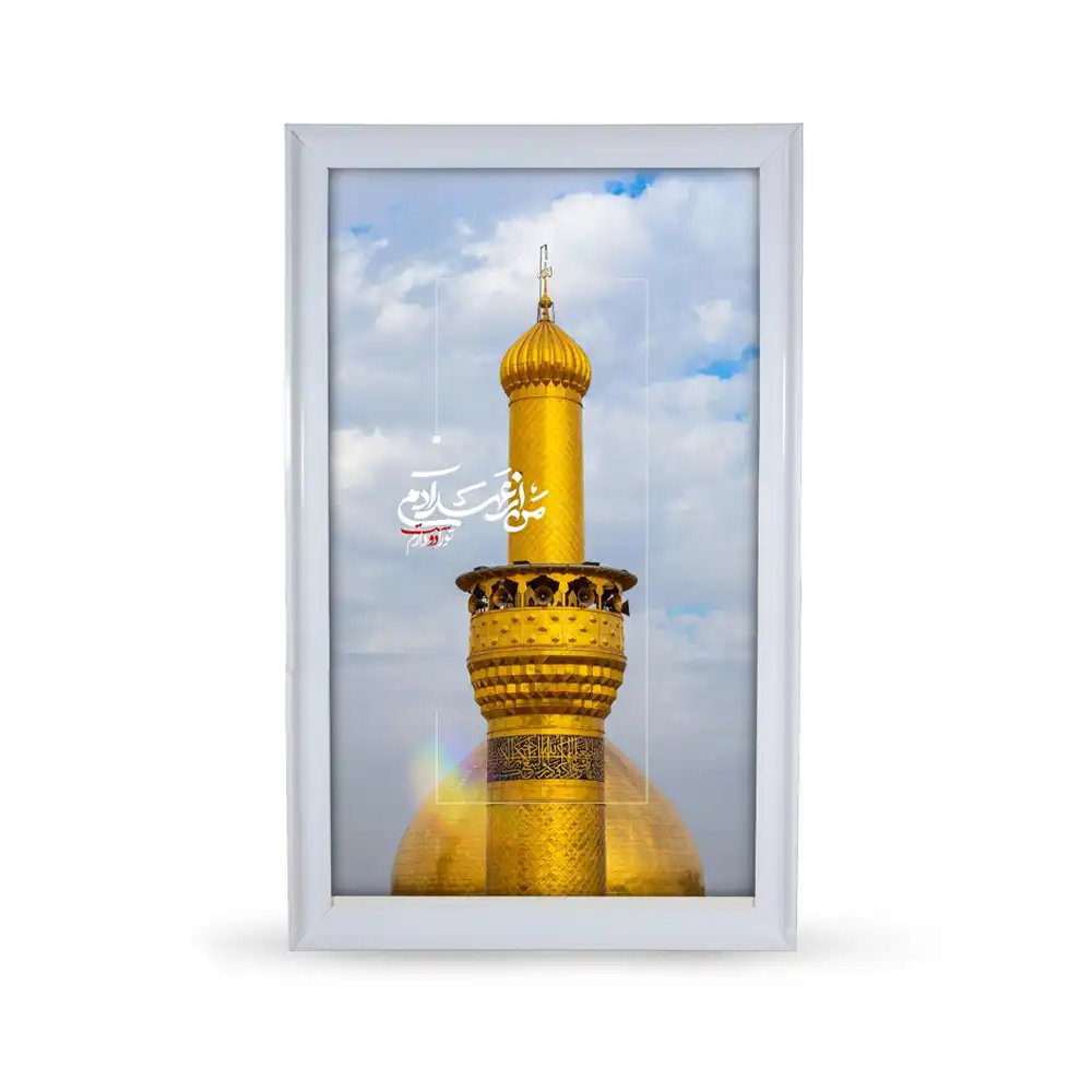 چاپ با کیفیت سابلیمیشن حرارتی بر روی مخمل لطیف و ضخیم، رنگ‌هایی گرم و عمقی با جزئیات دقیق ارائه می‌دهد. قاب سفید مدرن این اثر را به گزینه‌ای زیبا برای دکوراسیون معنوی در منازل، هیئت‌ها و فضاهای فرهنگی تبدیل کرده است.