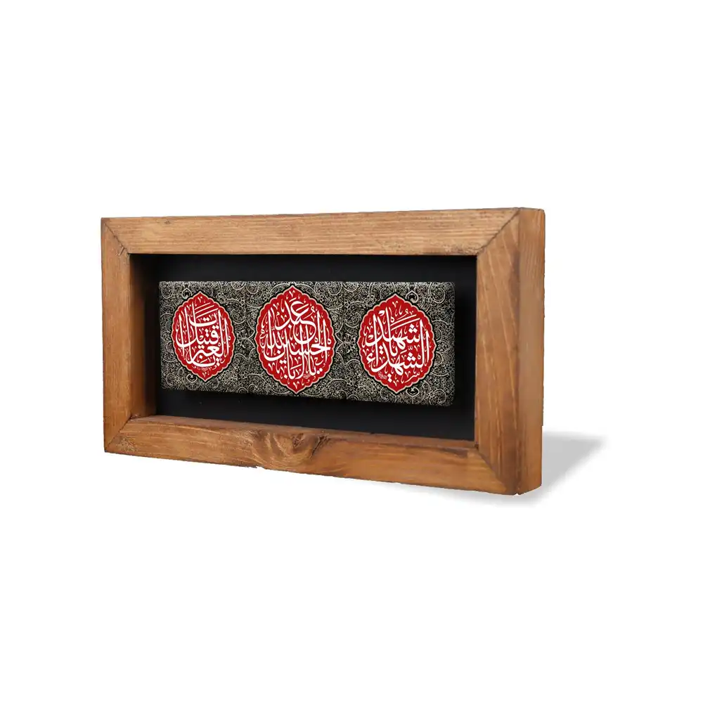 این قاب کاشی نفیس با عبارت پرشور “یا اباعبدالله الحسین علیه‌السلام”، تجلی عشق و ارادت قلبی به سیدالشهداست. طراحی ساده اما عمیق آن، برای ایام محرم، صفر و مجالس عزاداری بسیار مناسب است.