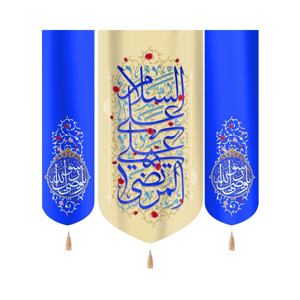 کتیبه ست مخمل با شعار السلام علی علی المرتضی کناره یا وصی الله زمینه کرم زمینه کناره آبی