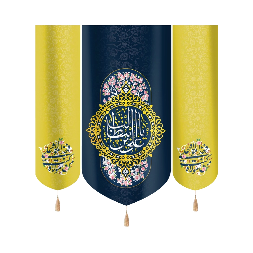 کتیبه غدیر ست مخمل با شعار یا علی ابن ابی طالب کناره ها من کنت مولاه فهذا علی مولاه زمینه سرمه ای کناره زرد