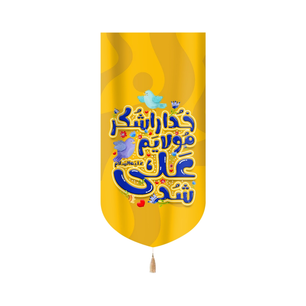 این کتیبه زیبا و منحصر به فرد با عنوان خدا را شکر مولایم علی (علیه السلام) شد زمینه زرد با الهام از مفاهیم مذهبی عمیق طراحی شده است. جنس این کتیبه از پارچه مخمل با کیفیت بالا بوده و دارای ابعاد مختلفی است که آن را به انتخابی مناسب برای نصب در مجالس مذهبی، مساجد، حسینیه‌ها و منازل می‌کند.