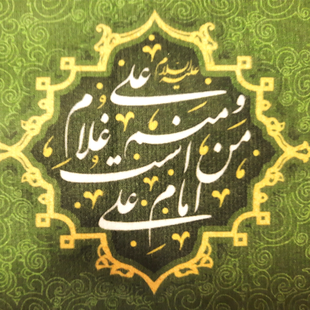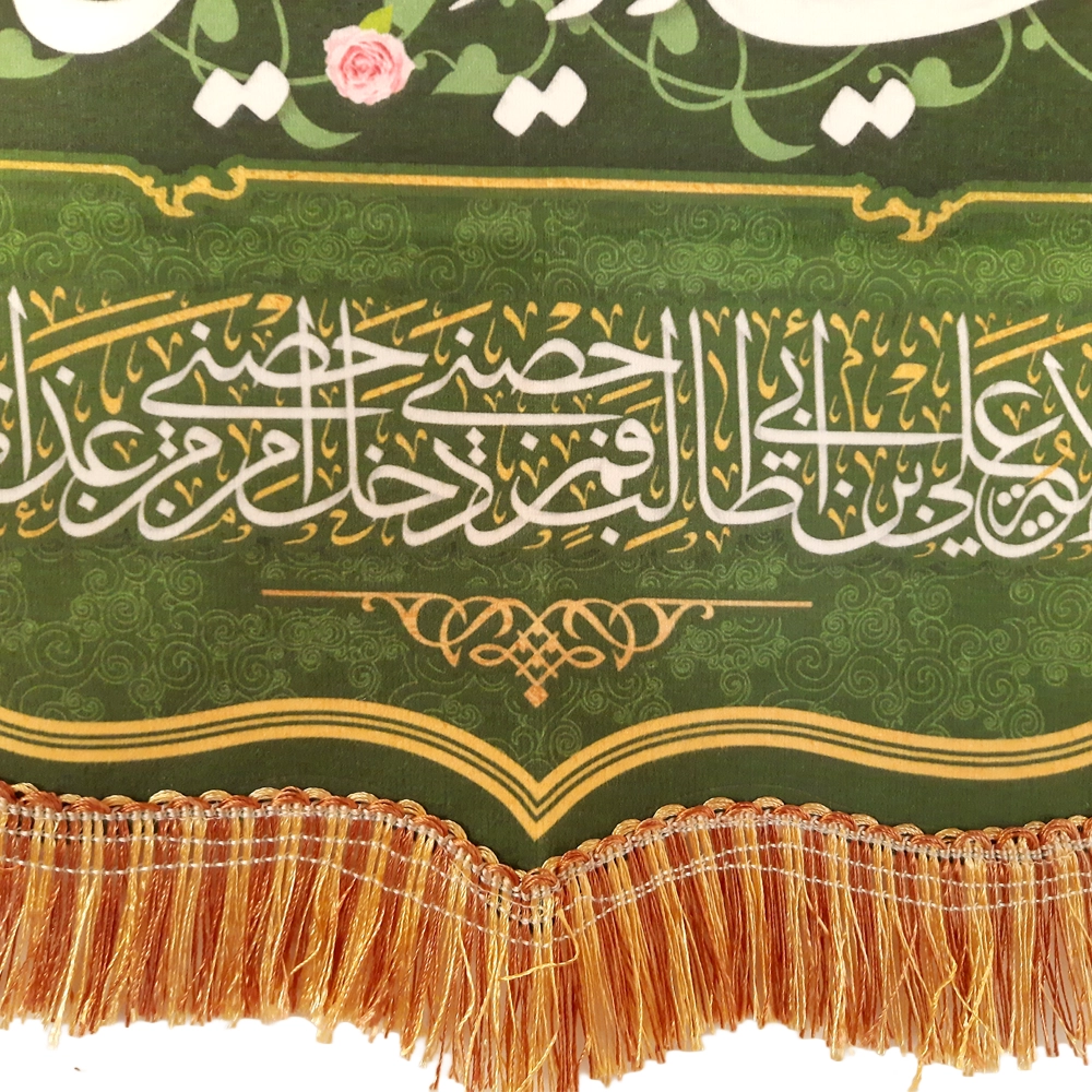 کتیبه غدیر مخمل من کنت مولاه فهذا علی مولاه ولایه علی ابن ابی طالب حصنی فمن دخل حصنی امن من عذابی زمینه سبز