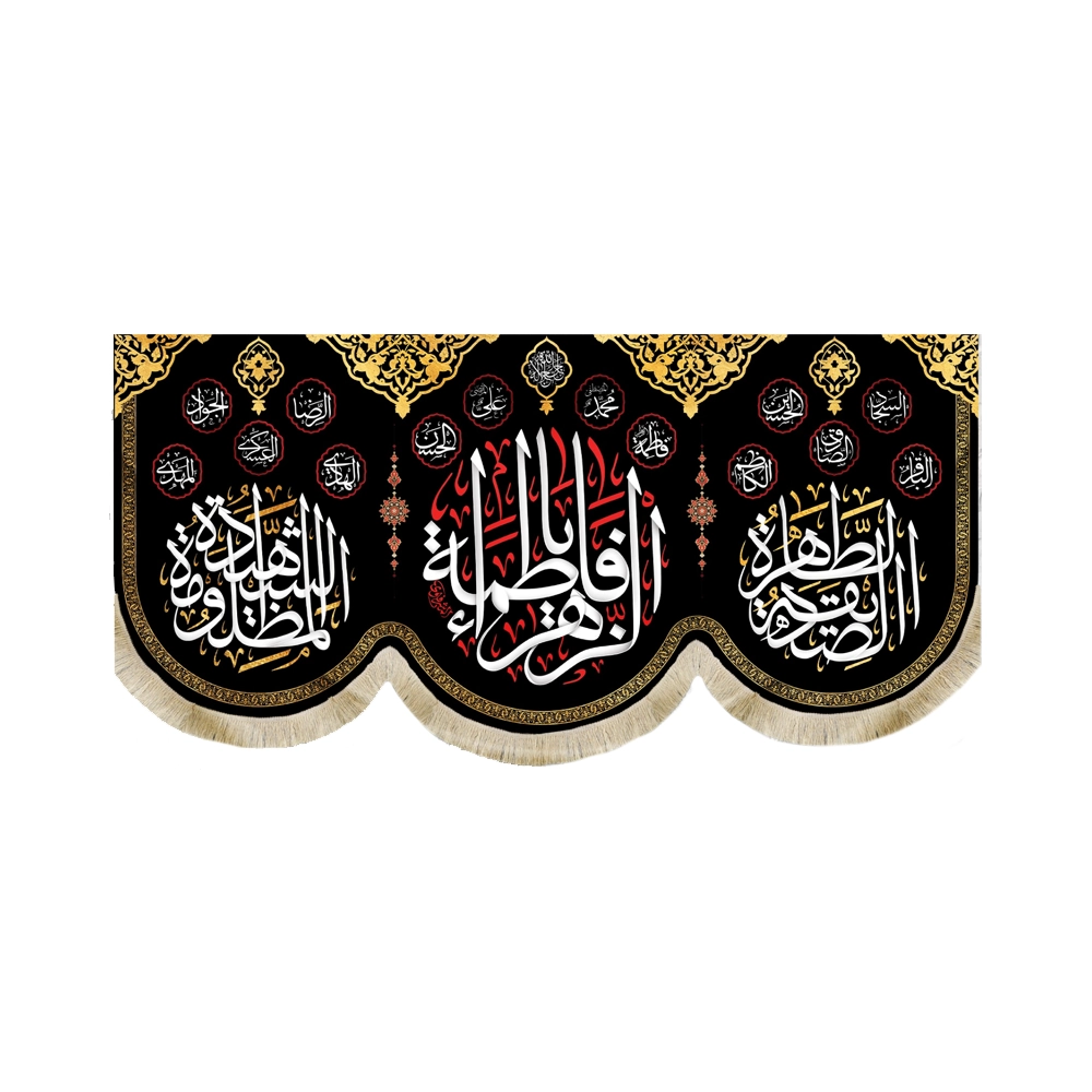در سمت راست کتیبه “الصدیقه الطاهره” و در سمت چپ کتیبه “المظلومه الشهیده” و در بالای کتیبه “اسامی چهارده معصوم” طراحی و چاپ شده است.