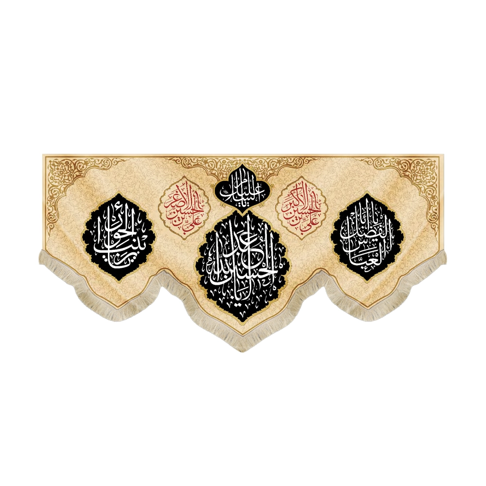 در سمت راست کتیبه “یا اباالفضل العباس” و “علی بن الحسین الاکبر” و سمت چپ “یا زینب الحورا” و “علی بن الحسین الاصغر” طراحی و چاپ شده است.