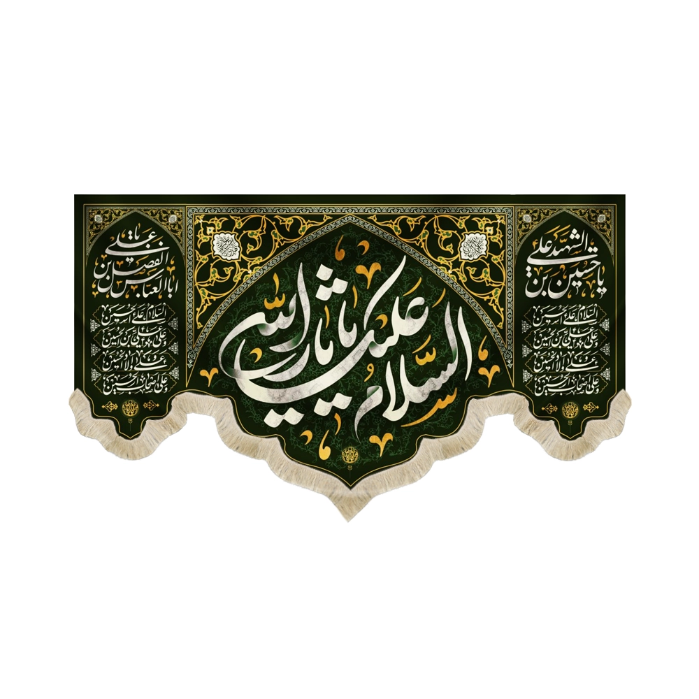 در سمت راست کتیبه “یا حسین بن علی الشهید” و “چهار سلام زیارت عاشورا” و در سمت چپ کتیبه “یا اباالفضل العباس بن علی” و “چهار سلام زیارت عاشورا” طراحی و چاپ شده است.