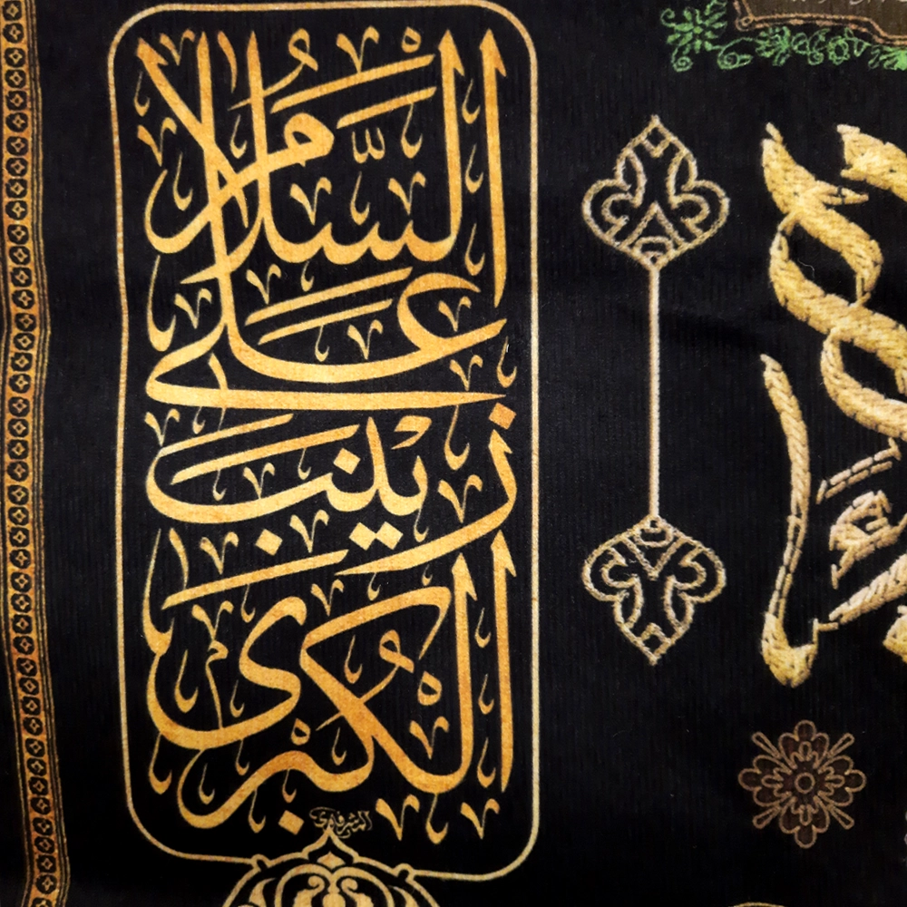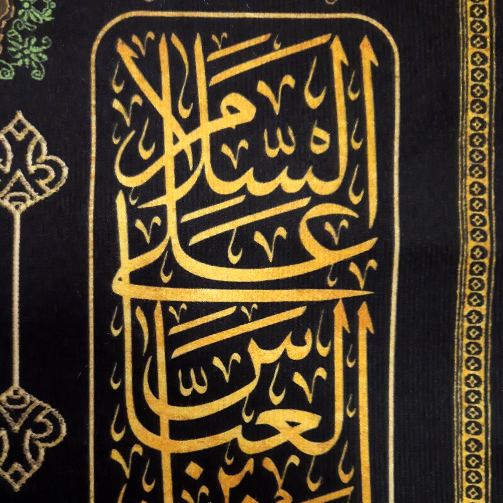 در بالای کتیبه “چهار سلام زیارت عاشورا”، در سمت راست “السلام علی العباس بن علی“ و در سمت چپ “السلام علی زینب الکبری” طراحی و چاپ شده است.