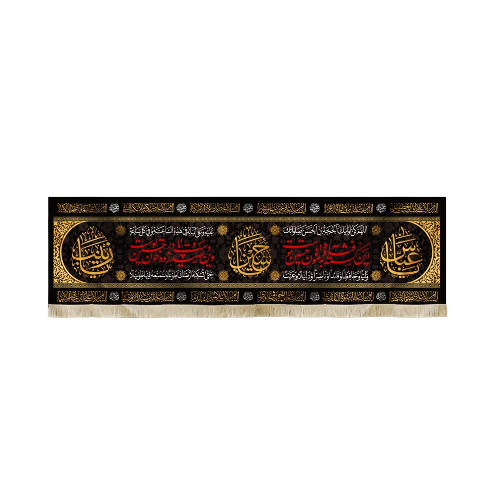 در وسط کتیبه عبارت “یا حسین” سمت راست کتیبه عبارت “یا عباس” و در سمت چپ عبارت “یا زینب” طراحی و چاپ شده است.