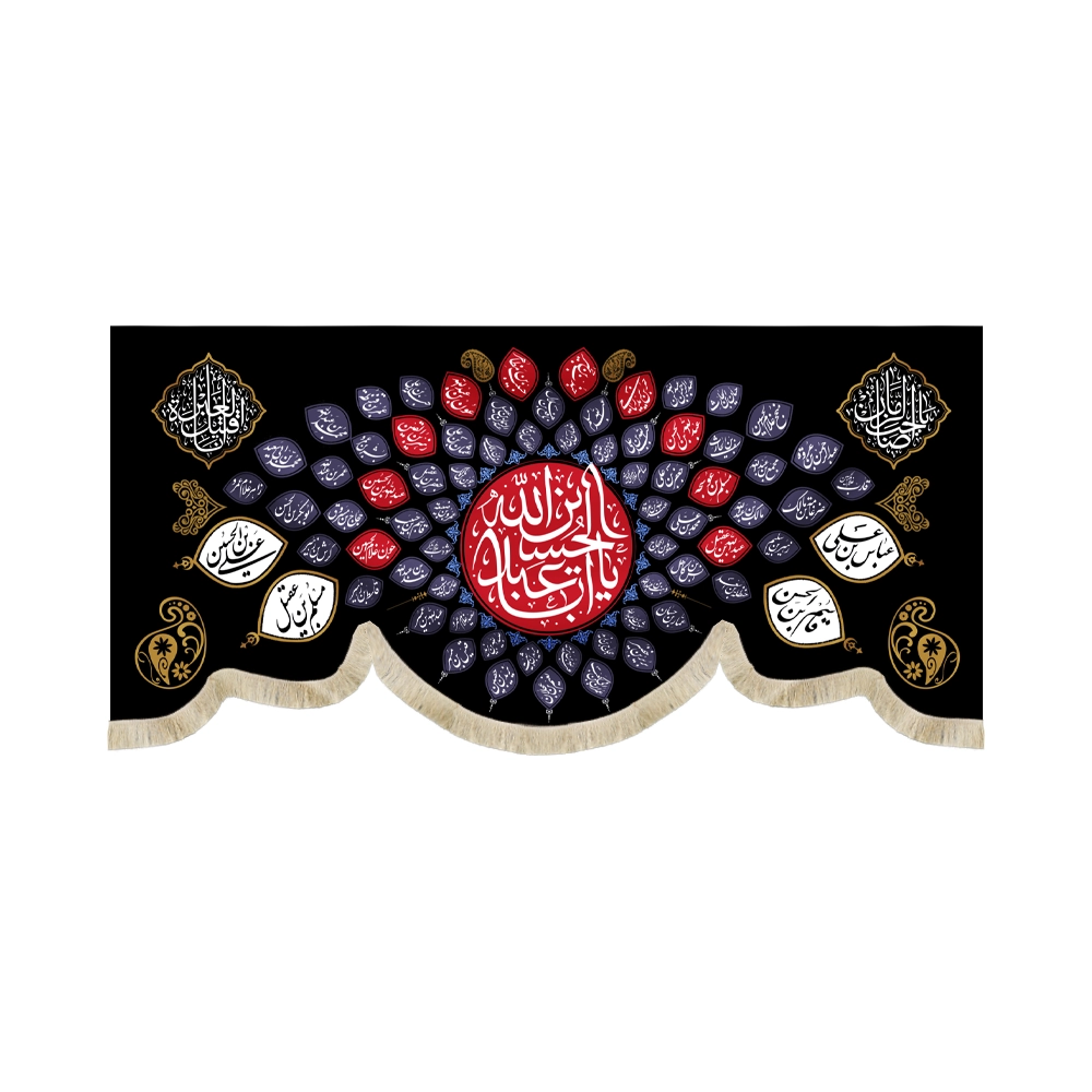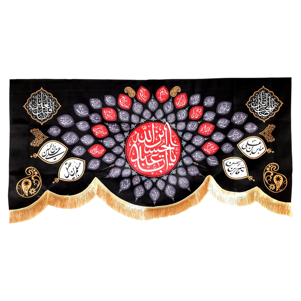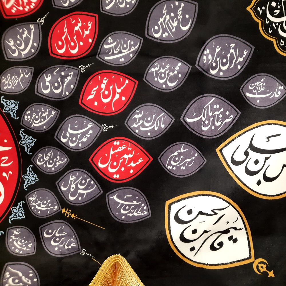 در سمت راست کتیبه “عباس بن علی” و “قاسم بن الحسن” و در سمت چپ “علی بن الحسین” و “مسلم بن عقیل” و در وسط “یا اباعبدالله الحسین” طراحی و چاپ شده است.