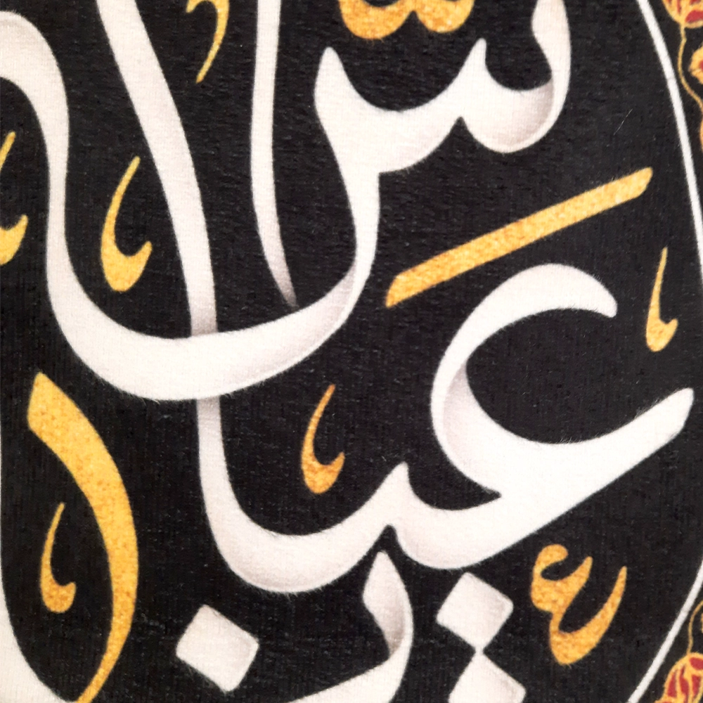 طراحی هنری: متن “یا عباس” با استفاده از بهترین تکنیکهای خطاطی اسلامی، به شکلی برجسته و دلنشین روی پارچه مخمل نوشته شده است.