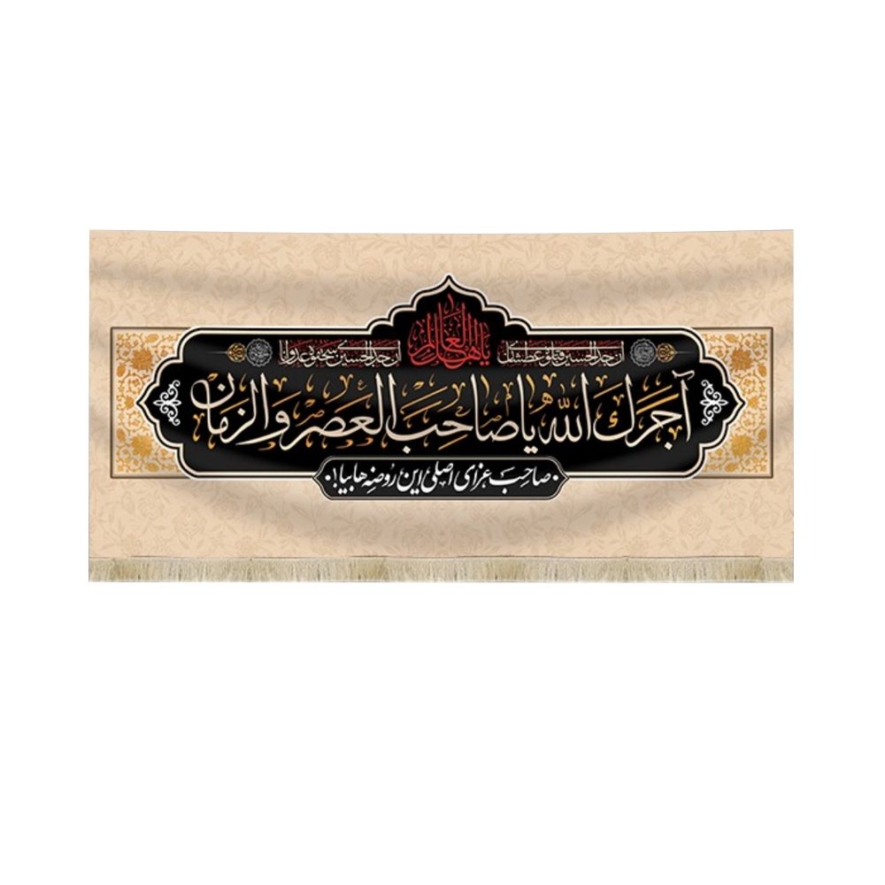 کتیبه مخمل با شعار آجرک الله یا صاحب العصر و الزمان صاحب عزای اصلی این روضه ها بیا زمینه کرم