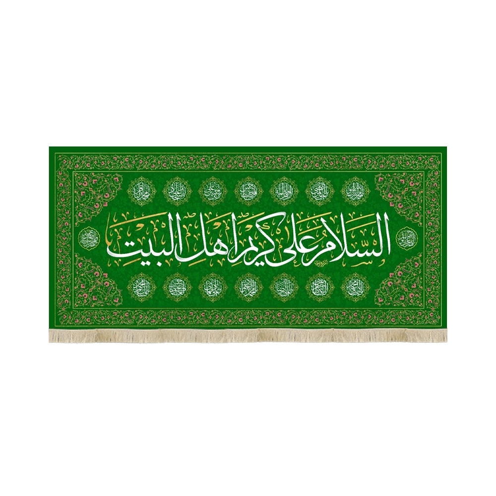 کتیبه مخمل السلام علی کریم اهل البیت حاشیه چهارده معصوم زمینه سبز