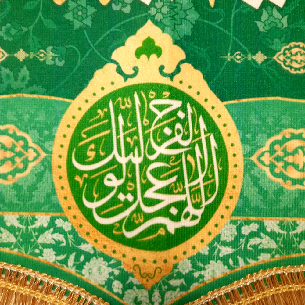 کتیبه مخمل با شعار السلام علیک یا جواد الائمه اللهم عجل لولیک الفرج زمینه سبز کد 52097
