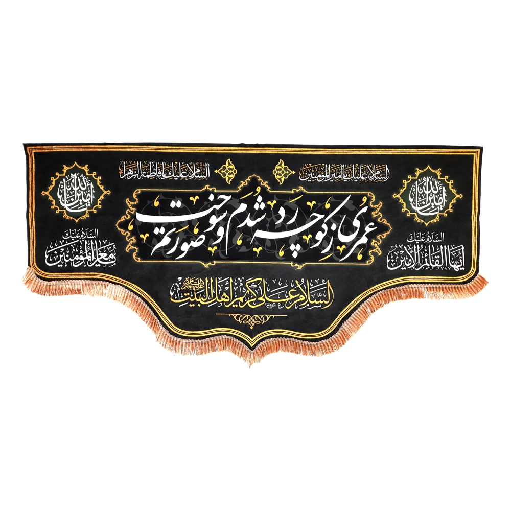 این کتیبه زیبا و منحصر به فرد با عنوان “عمری ز کوچه رد شدم و سوخت صورتم” با الهام از مفاهیم مذهبی عمیق طراحی شده است. جنس این کتیبه از پارچه مخمل با کیفیت بالا بوده و دارای ابعاد مختلفی است که آن را به انتخابی مناسب برای نصب در مجالس مذهبی، مساجد، حسینیهها و منازل میکند.