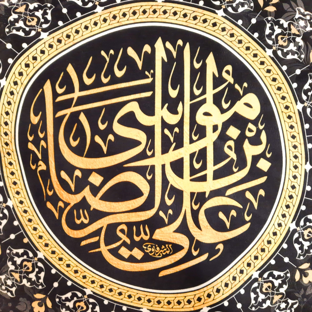 در سمت راست کتیبه “حسن بن علی المجتبی” و در سمت چپ کتیبه “علی بن موسی الرضا” طراحی و چاپ شده است.
