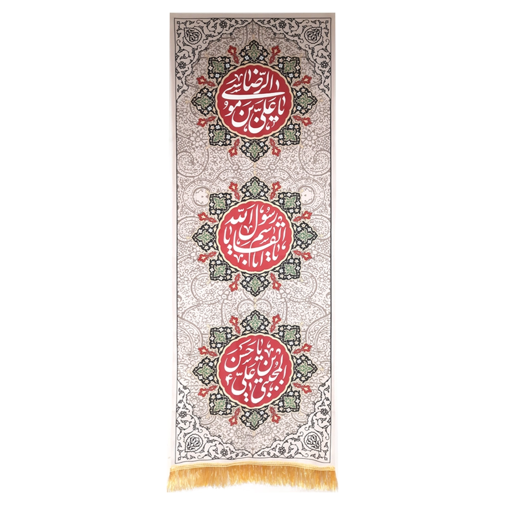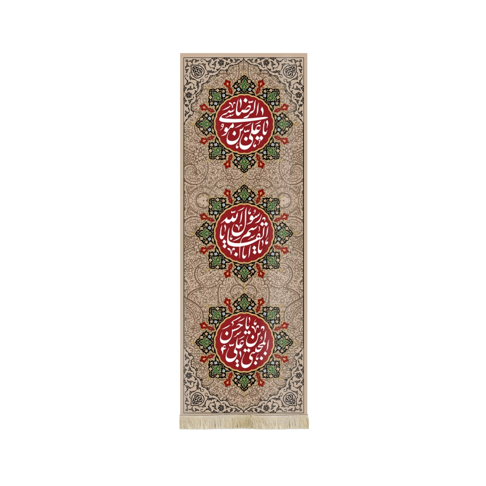 در بالا کتیبه “یا علی ابن موسی الرضا” و در پایین “یا حسن ابن علی المجتبی طراحی و چاپ شده است.