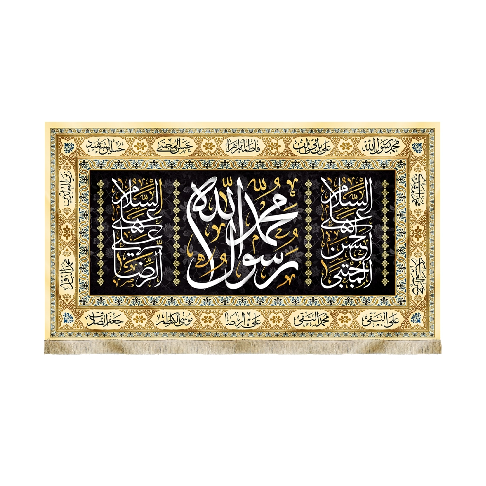 کاربردهای متنوع: این کتیبه مذهبی میتواند در مجالس و مراسم عزاداری، هیئتها، مساجد، حسینیهها، و حتی منازل مورد استفاده قرار گیرد. نصب این کتیبه به عنوان نمادی از ارادت و عشق به حضرت محمد (صلی الله علیه و آله و سلم)، فضای معنوی و روحانی خاصی به محیط میبخشد.
