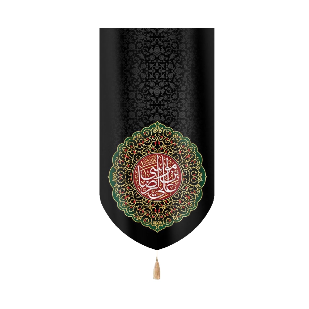 کتیبه مخمل با شعار علی بن موسی الرضا علیه السلام زمینه مشکی عمودی تک عددی